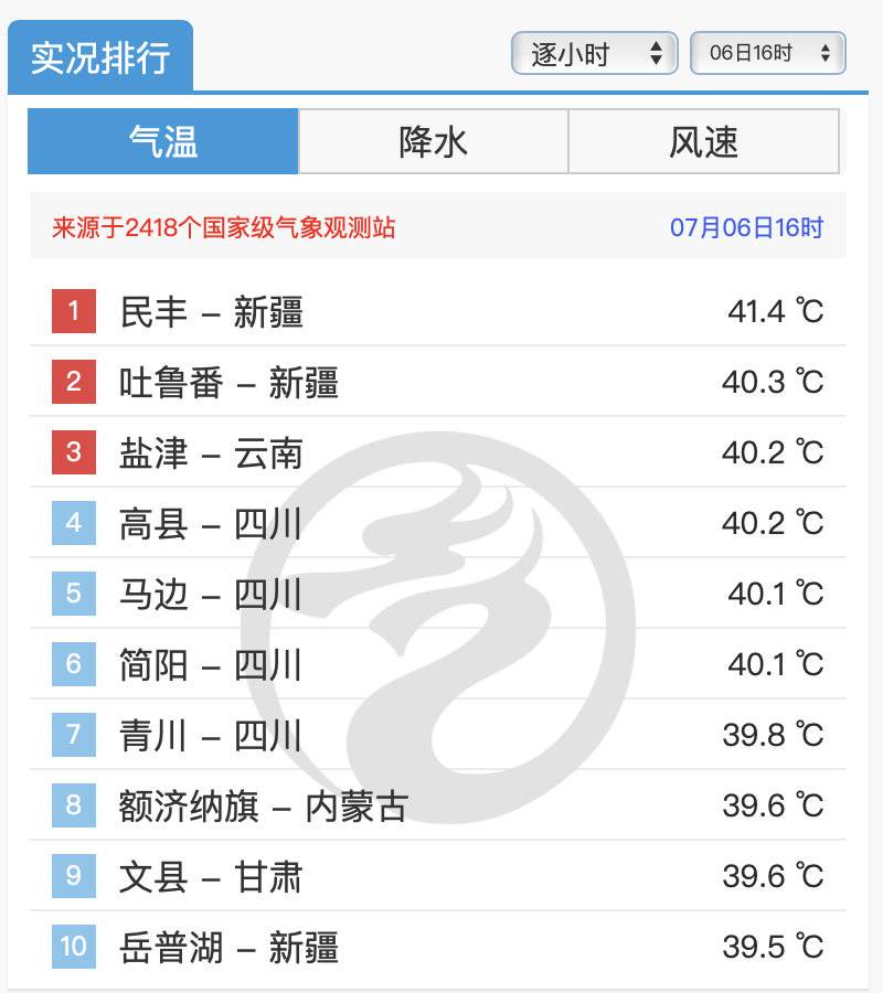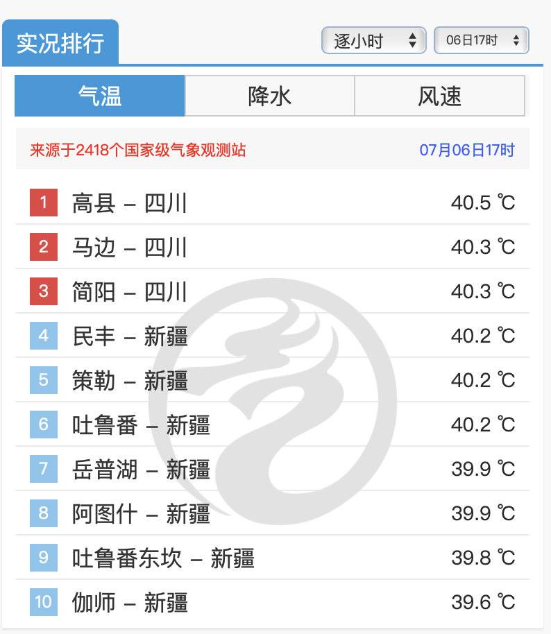 全国2418个国家级气象观测站的气温排名前十,4个都是四川,其中,宜宾高县气温达到40.2℃,与云南盐津并列第三。
