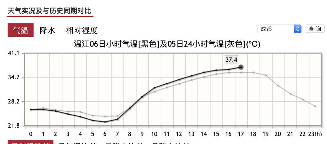 虽然成都简阳站也观测到超过40℃的气温,但成都的“官方”气温来自温江国家基准气候站测得的数据。6日17时,温江站气温达到37.4℃,创今年以来新高,但尚未打破此前曾出现的37.7℃这一纪录。