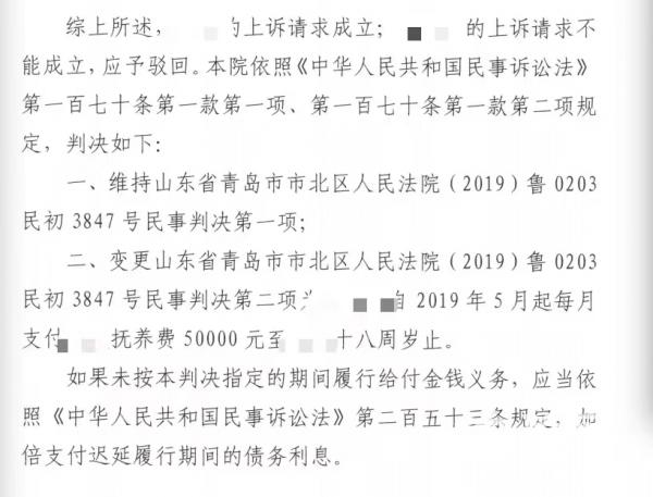 事情并未完结,林女士随即进行了上诉,2020年4月3日,青岛市中级人民法院认为两人的离婚符合法定程序,离婚时所签订的协议也具备法律效力,既然姜先生在离婚协议签了字,就应该继续履行,又将抚养费改判回每月5万。