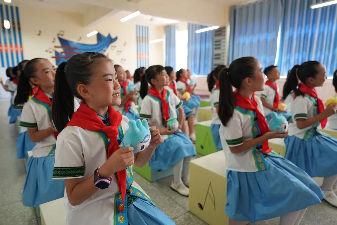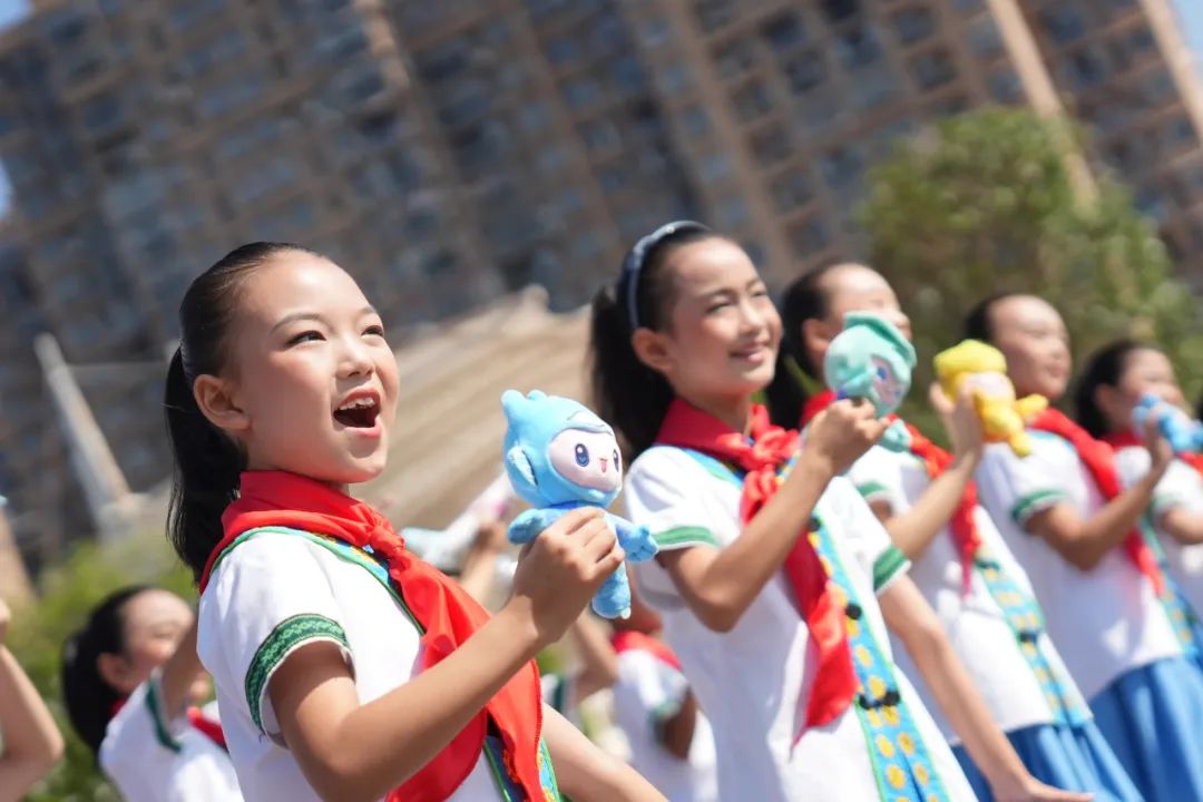 “新鲜出炉”的亚运歌曲可难不倒这些能歌善舞的孩子们。他们身着民族特色的校服,手捧吉祥物玩偶,很快就熟悉了旋律,熟练地哼唱了起来。轻亮可爱的歌声飘响在校园广场上。