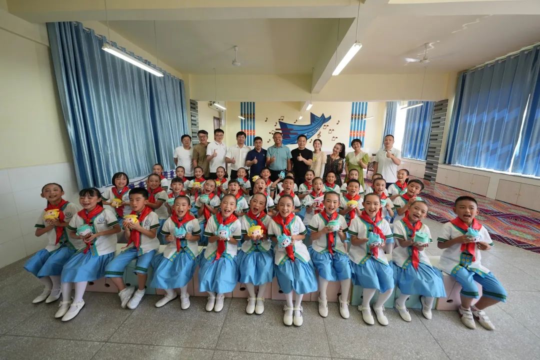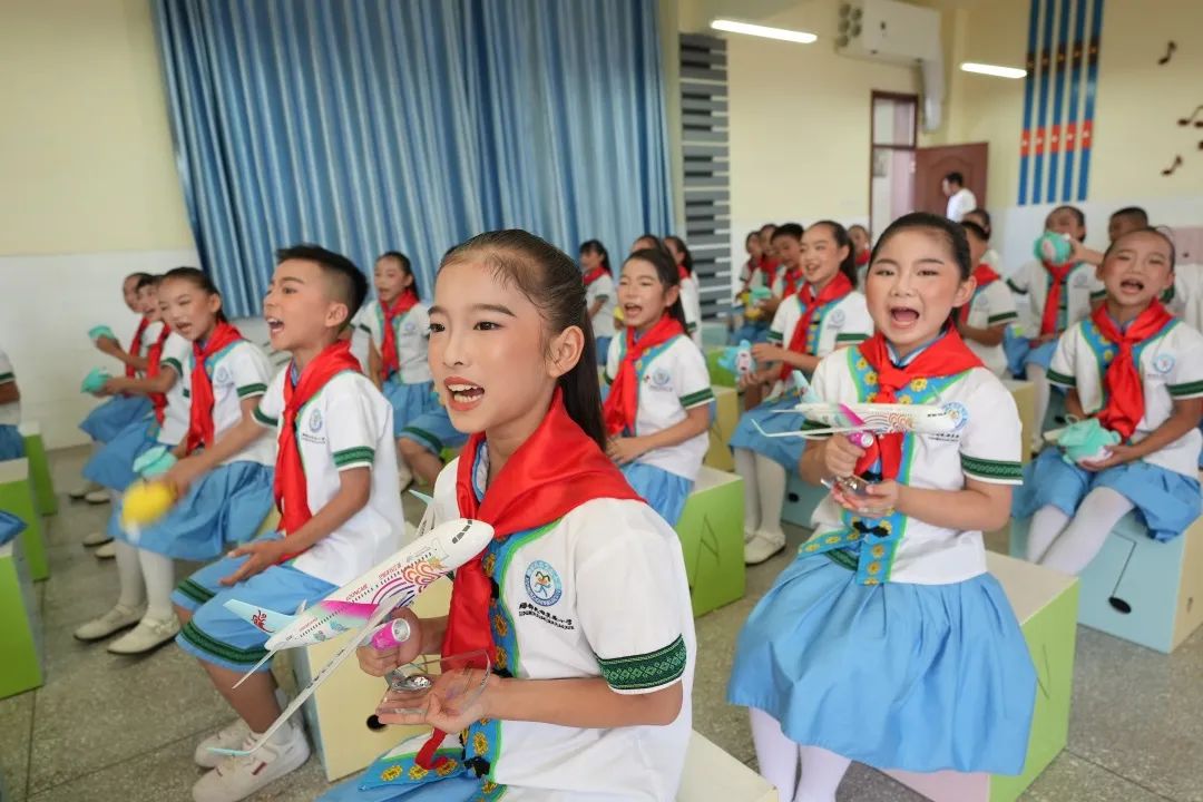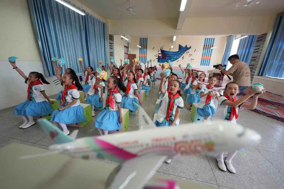 同时,浙江长龙航空有限公司向硒都民族实验小学捐赠了数架身长38cm的杭州亚运会主题彩绘飞机模型,机身都带有亚运会吉祥物图案。