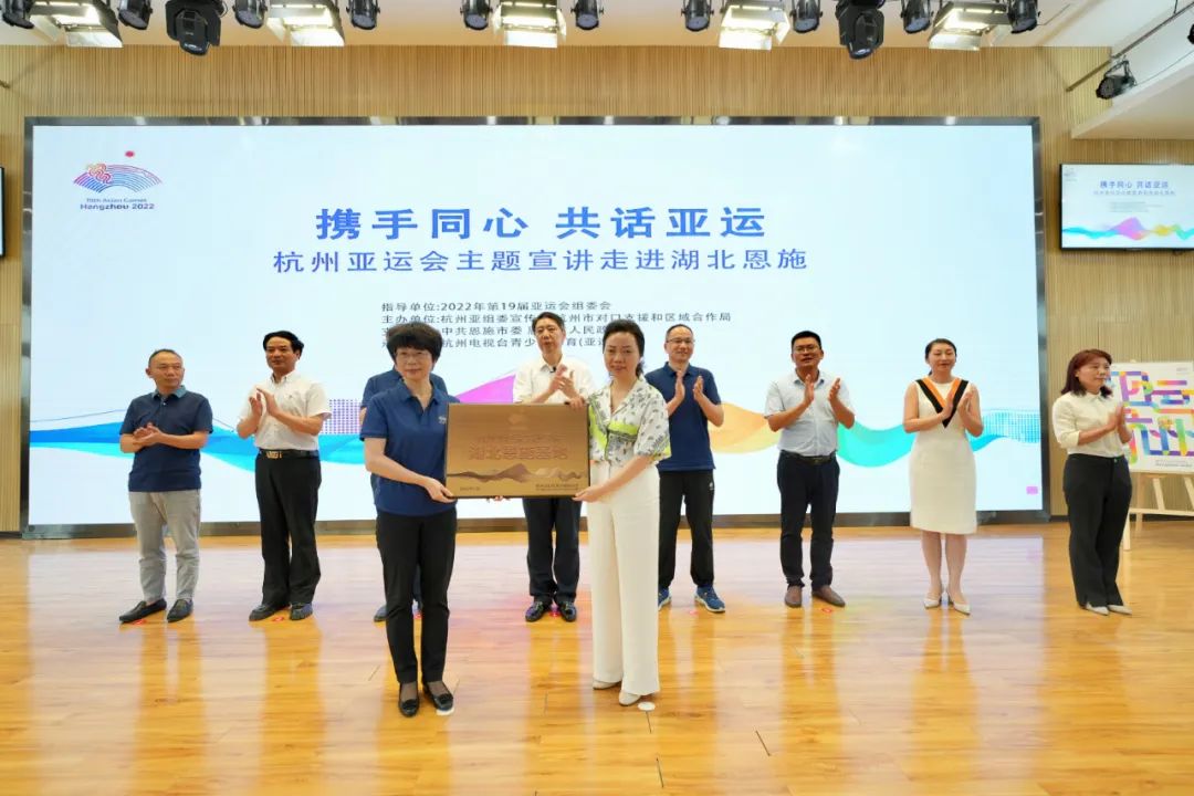 会上,杭州亚组委宣讲团一行向恩施授予“亚运主题宣讲基地”牌匾。