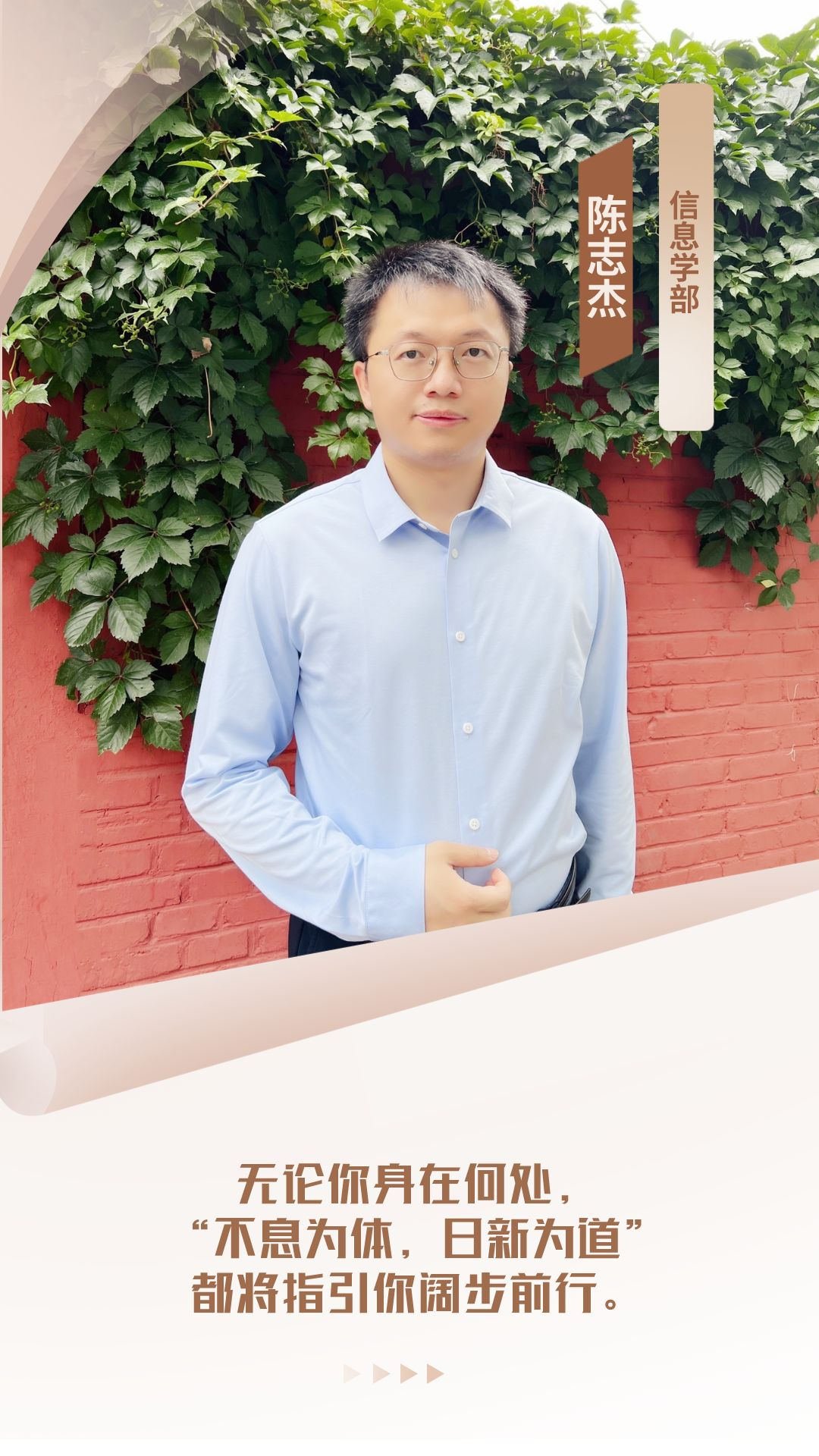 胡适曾言:‘日拱一卒,功不唐捐’。做任何事情都是一个从量变到质变的过程,学习如是,科研如是。希望同学们作为新时代的建设者,不忘初心,志存高远,以青春奋斗,拥抱美好未来。