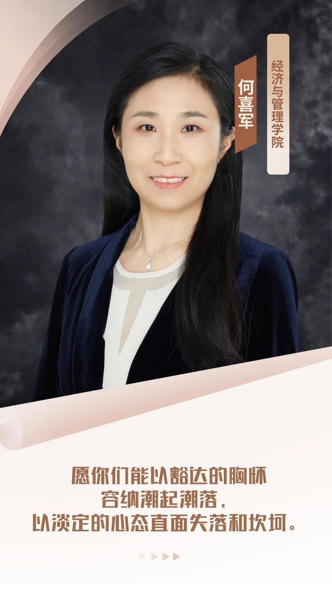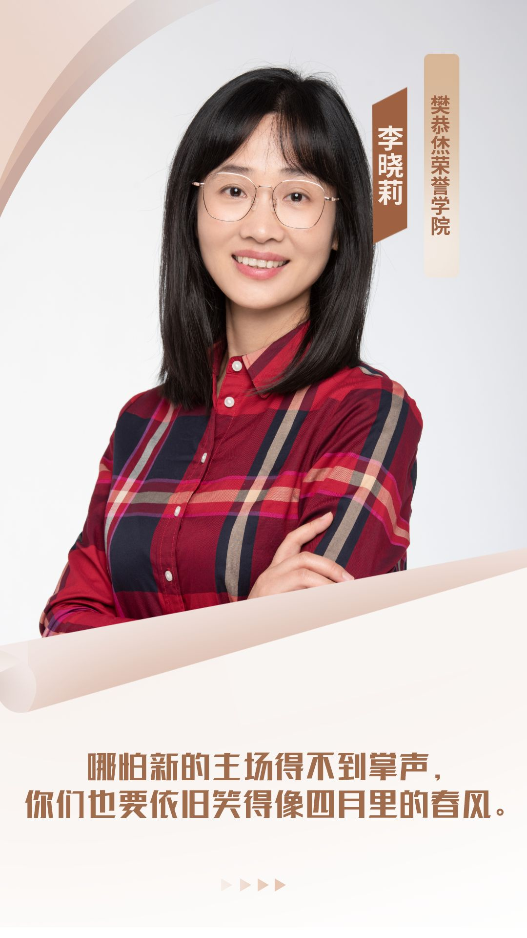 同学们即将开启崭新的人生,对未来期待不已的同时,也难免迷惘不安。我最亲爱的同学们,当你们畅想未来时,请记得你们该问自己的问题不是未来会发生什么,而是当事情发生时,我会是什么样的人。同时也请记得哪怕新的主场得不到掌声,你们也要依旧笑得像四月里的春风。