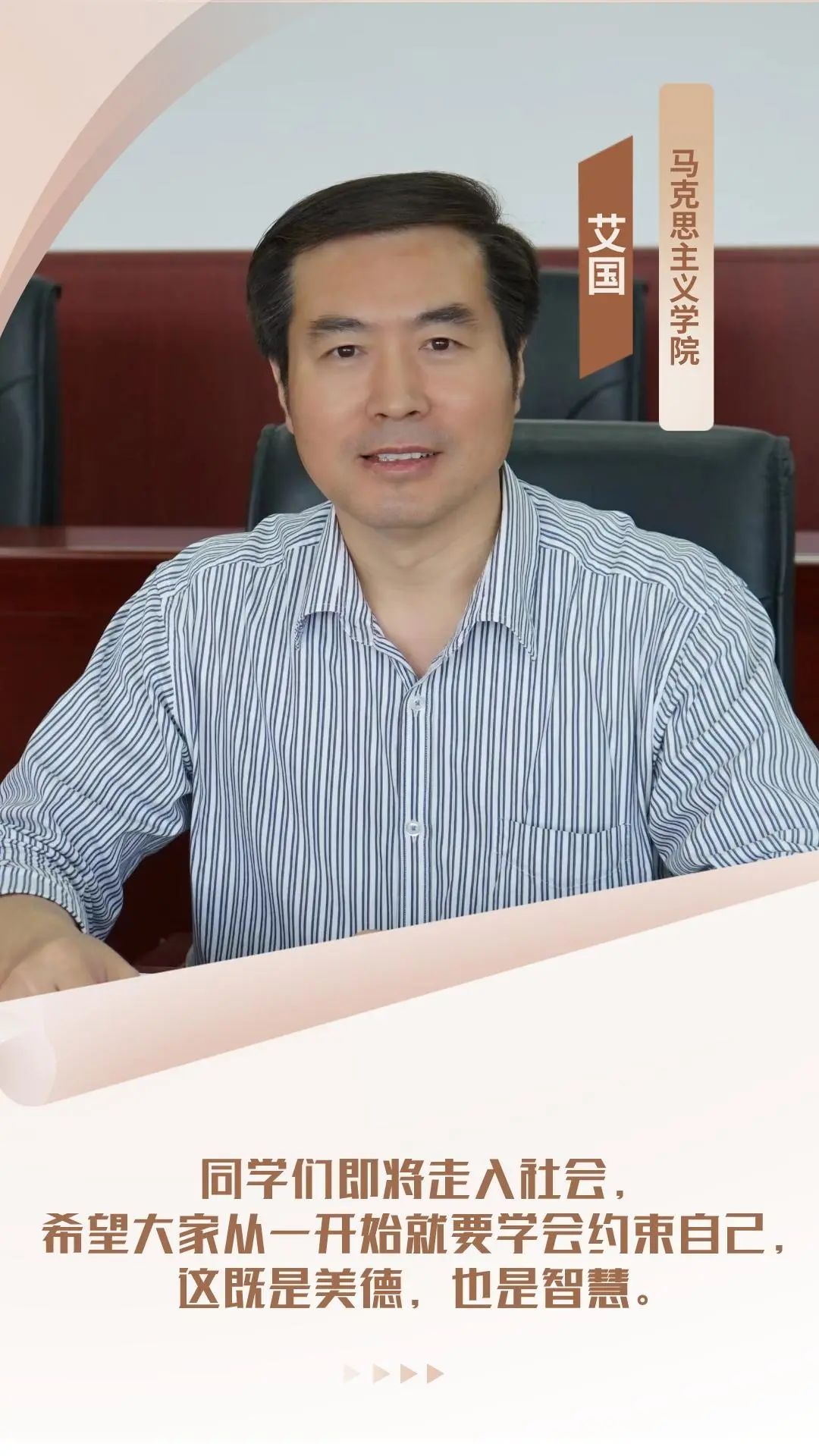 孔子说,‘以约失之者鲜矣’。人有过失,不是因为约束自己,而是因为放纵自己。《礼记》中说,敖不可长,欲不可从,志不可满,乐不可极。人生的方方面面都需要自我约束。人类本性崇尚自由,但自由离不开对必然的把握,只有认识并遵从规律,才能获得真正的自由,所谓‘从心所欲不逾矩’。因此自由与纪律、规则、法度是不可分离的,放纵不仅不是自由,还会导致失去自由。同学们即将走入社会,希望大家从一开始就要学会约束自己,这既是美德,也是智慧。