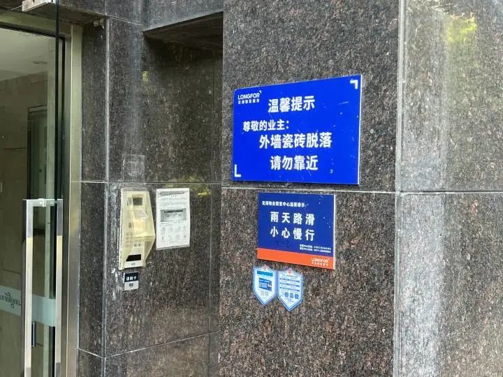 在小区每栋楼下面,小时新闻记者看到贴着“尊敬的业主:外墙瓷砖脱落请勿靠近”的温馨提示,单元楼门口也贴了同样的告示。