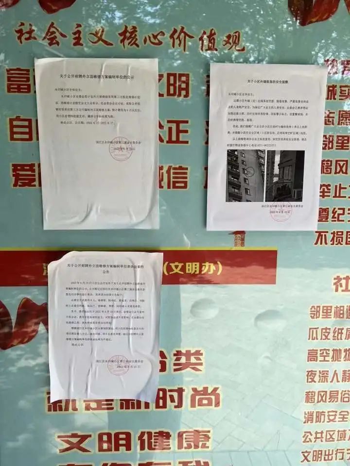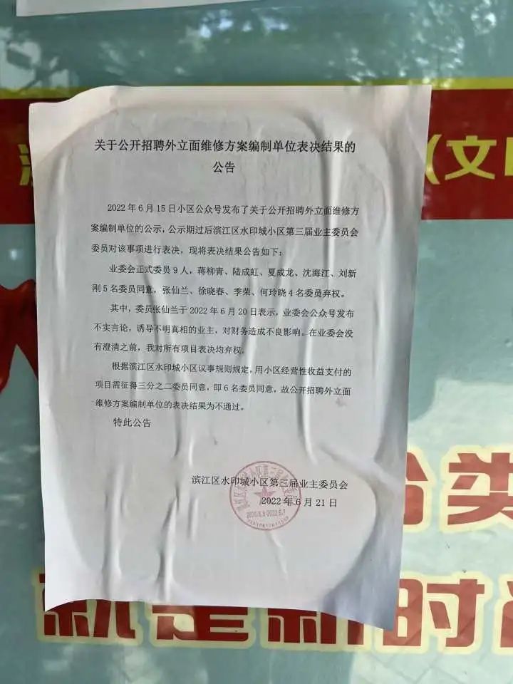 在小区入口的公告栏,记者看到贴有三份公告,一份为《关于小区外墙脱落的安全提醒》,提醒照片上的外墙墙砖出现虚浮的情况。另两份分别为《关于公开招聘外立面维修方案编制单位的公示》和《表决结果的公告》,公示中提到,业委会拟计划外立面维修采用第三方拟定维修计划后提交业主大会审议……预计费用6万元左右,用小区经营性收益支付。而根据公告结果,业委会9名成员投票,5名同意,4名弃权,故表决结果为不通过。