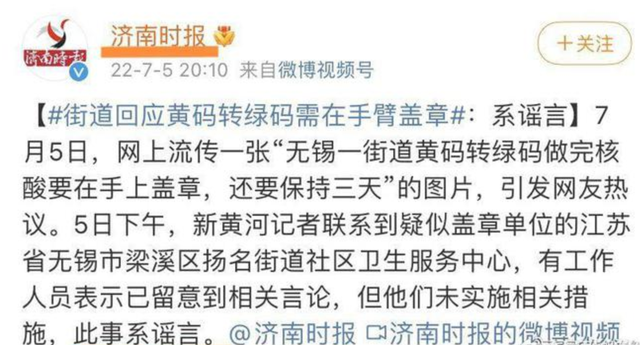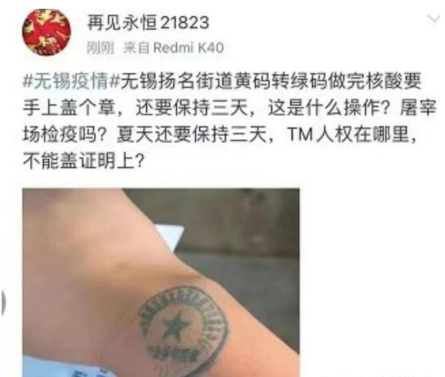7月5日,网上流传一张“无锡一街道黄码转绿码做完核酸要在手上盖章,还要保持三天”的图片,引发网友热议。