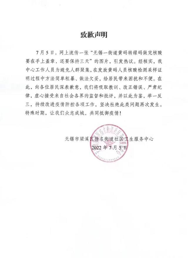 7月5日晚,无锡市梁溪区扬名街道社区卫生服务中心发布致歉声明。
