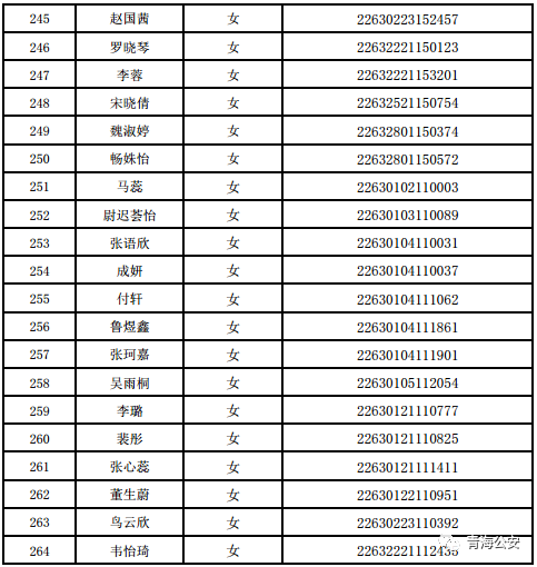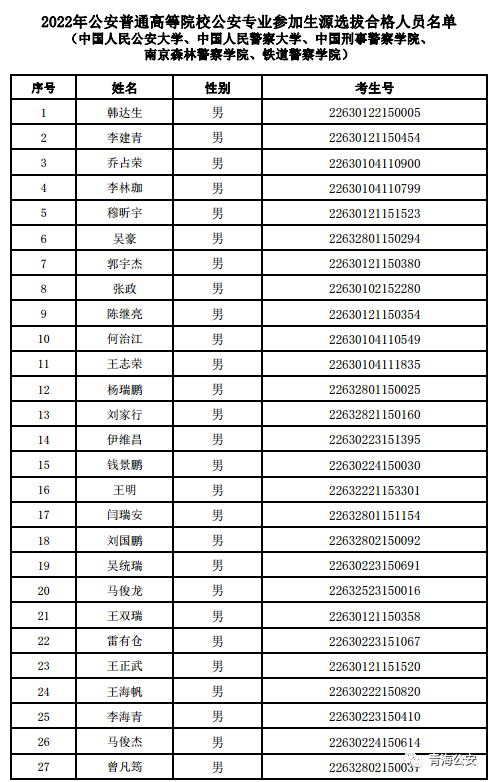 按照教育部、公安部有关普通高等学校招生工作规定和《关于2022年公安普通高等院校在青招生工作有关事宜的通知》要求。7月2日至7月4日,在前期政治考察合格的基础上,青海省公安厅政治部会同相关部门警种,严格按照规定程序完成公安部直属公安院校(中国人民公安大学、中国人民警察大学、中国刑事警察学院、南京森林警察学院、铁道警察学院)的面试、体能测评和体检工作,共选拔合格生源264名,现将《2022年公安部直属公安院校在青生源选拔合格人员名单》函达。