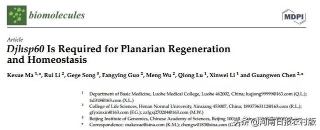 相关研究论文发表在国际知名期刊Biomolecules(IF=6.064),题目为“Djhsp60 is required for planarian regeneration and homeostasis”(doi: 10.3390/biom12060808,论文链接:https://pubmed.ncbi.nlm.nih.gov/35740934/)。这是漯河医学高等专科学校高水平研究论文的一大突破,论文的第一作者和通讯作者是马克学博士,河南师范大学陈广文教授为共同通讯作者。