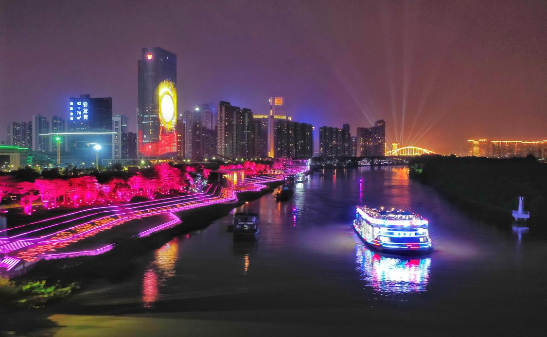三龙湾号行经流光溢彩的东平水道龙舟广场段。/佛山日报记者张弘弢摄