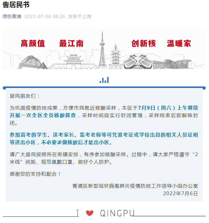 为巩固疫情防控成果,尽早发现和控制疫情风险,浦东新区将于7月6日至7月8日开展全域全员“3天2检”(即3天内完成两次核酸检测,至少间隔24小时)。同时,在7月9日(周六)将继续开展全域便民核酸采样服务。具体安排如下: