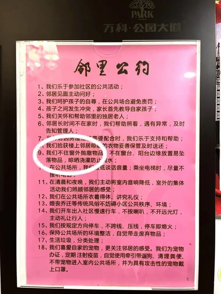 小区有邻里公约,其中第九条有相关高空抛物的约定。