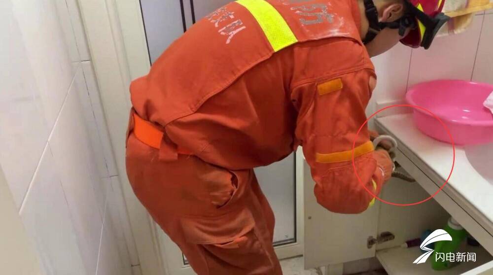 消防救援人员到达现场后,发现有一条长约1米左右的青花蛇,盘在洗漱台下。