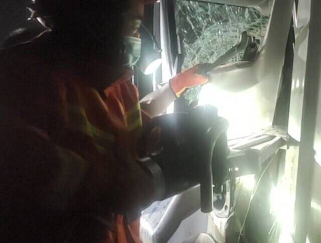 “别紧张,除了腿哪里还被卡住了?”“腿被卡住了,其他没什么问题。”在确认被困者身体被卡部位后,消防救援人员立即展开救援。首先利用液压破拆工具组进行破拆,随后利用液压扩张器对驾驶室受力部位进行扩容,一点一点扩大救援空间,经过8分钟的救援,成功将被困人员救出。