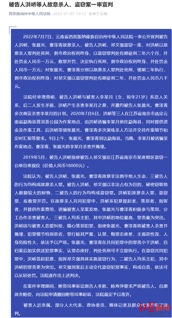备受关注的南京女大学生被害案7日宣判。结果如下:2022年7月7日,云南省西双版纳傣族自治州中级人民法院一审公开宣判被告人洪峤、张晨光、曹泽青故意杀人,被告人洪峤、祁文强盗窃一案,对洪峤以故意杀人罪判处死刑,剥夺政治权利终身,以盗窃罪判处有期徒刑二年六个月,并处罚金人民币一万元,数罪并罚,决定执行死刑,剥夺政治权利终身,并处罚金人民币一万元;对张晨光、曹泽青分别以故意杀人罪判处死刑,缓期二年执行,剥夺政治权利终身;对祁文强以盗窃罪判处有期徒刑二年,并处罚金人民币八千元。