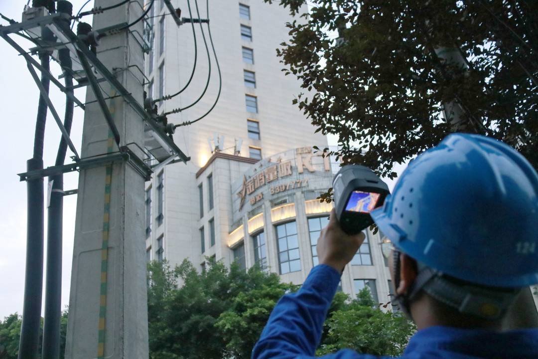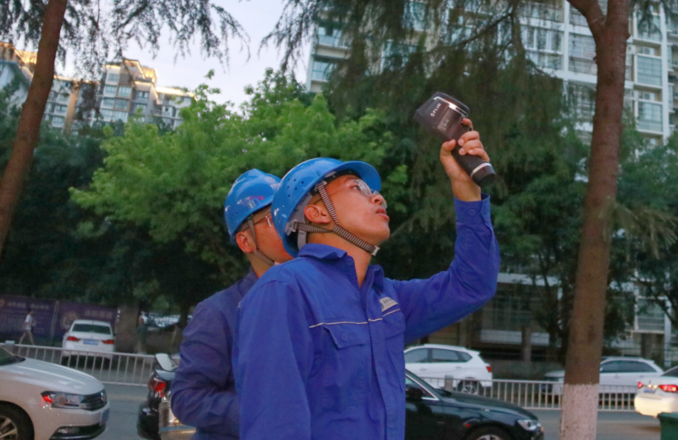 “扫一下左边那第二根线呢?”“扫了,测温正常。”在镇江东路,两位工作人员身穿蓝色工作服、头戴安全帽、手持电力红外测温仪,重点对该路段负载较大的线路和设备进行测温,力争做到“早发现,早处理”,全力保障电力设备安全稳定运行。