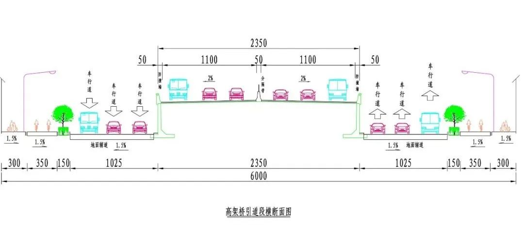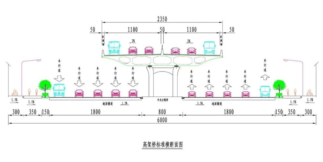 该高架桥连续跨越民航路、东山过境高速、东峰路,采用现浇预应力混凝土箱梁和钢箱梁,桥梁宽度为23.5米。其宽度足以保证双向6车道,通行能力超过现有的太榆路。