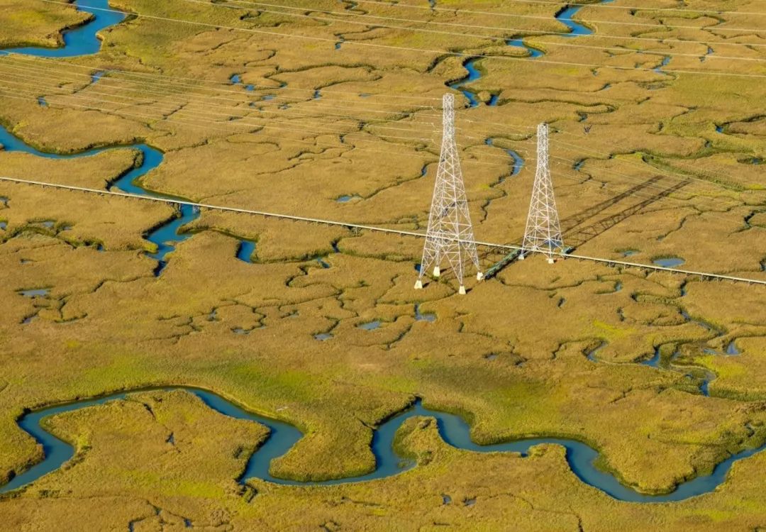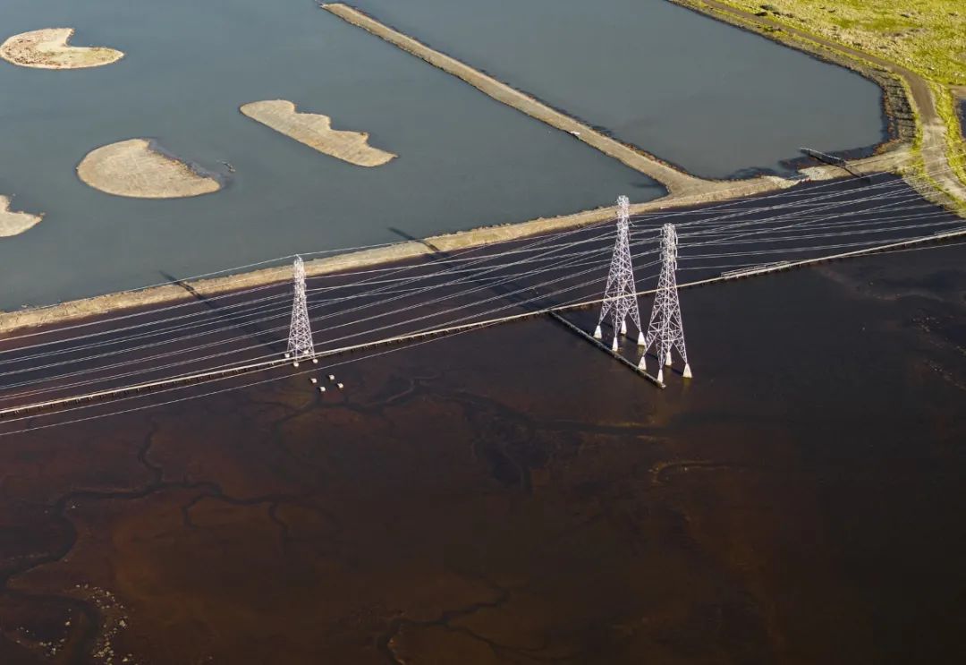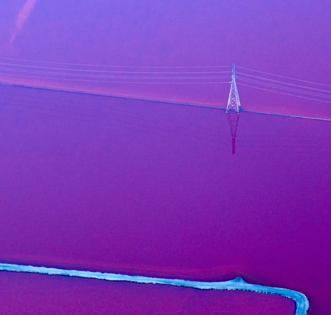 奇幻的地貌上竟长出一个个电缆塔,秀丽壮阔的大景搭配笔直的建物,形成一种对立但并非违和,看似不够自然的生态,在某些情况下却成为抽象化的意境,以大范围的浓郁色彩,凸显电缆塔的只身。
