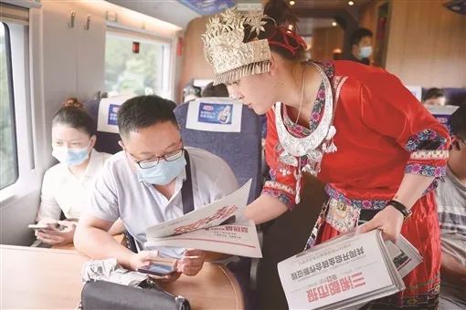 “奔向美好,相约湖南”。在开往张吉怀的“美好号”主题列车上,乘务员“变身”导游,与湖南日报社犇视频一起邀请乘客同赏大湘西美景;