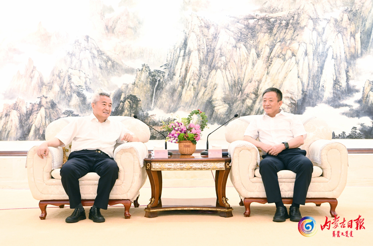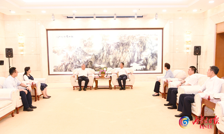 7月6日上午,自治区党委书记孙绍骋在呼和浩特拜会全国政协副主席、九三学社中央常务副主席邵鸿。记者 袁永红 摄