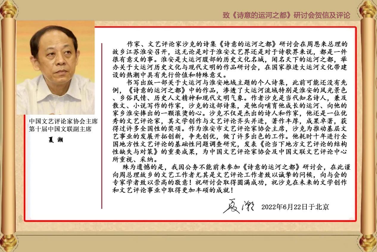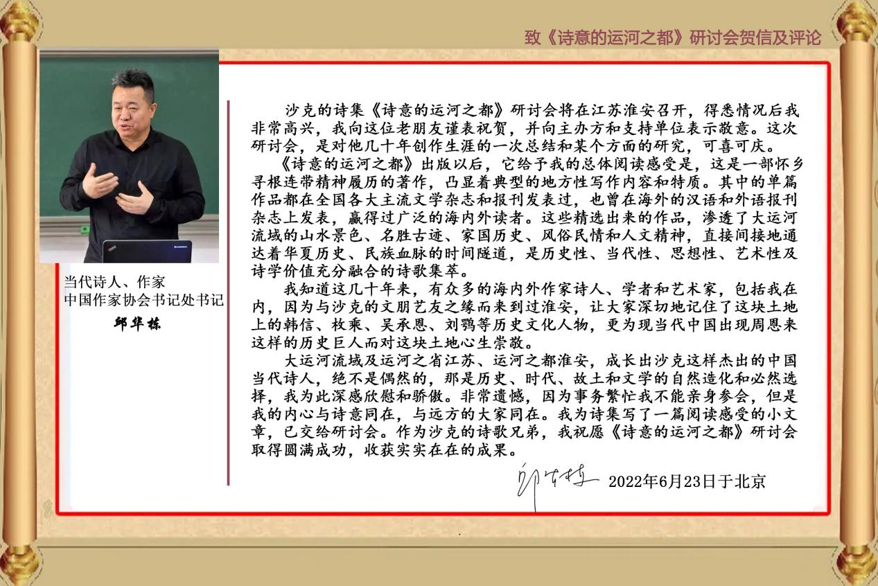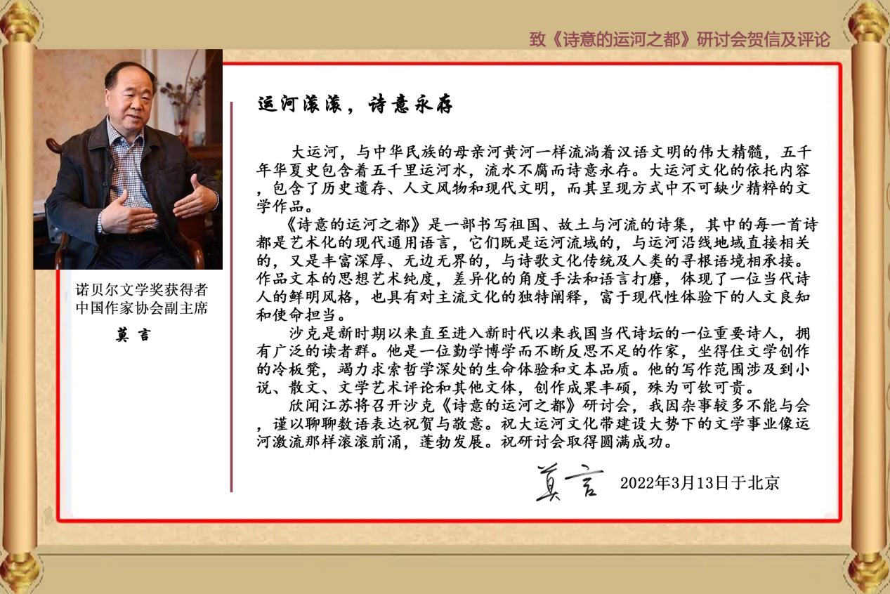 “大运河流域及运河之省江苏、运河之都淮安,成长出沙克这样杰出的中国当代诗人,绝不是偶然的,那是历史、时代、故土和文学的自然造化和必然选择,我为此深感欣慰和骄傲。非常遗憾,因为事务繁忙我不能亲身参会,但是我的内心与诗意同在,与远方的大家同在。”