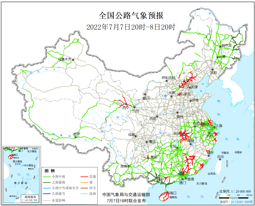 交通运输部发布出行提示:7月7日20时至8日20时,内蒙古东部、黑龙江西北部和东部、吉林东部、广西、广东西部等地部分地区有中到大雨,其中,内蒙古东北部、黑龙江东部、吉林东部、广西南部、广东西南部等地局地有暴雨。北京西部和北部、河北北部、江苏南部、浙江东部、福建东北部和东南部、江西南部、湖北东部、广东中部、广西东南部、海南岛大部、贵州中部、青海东部等地局地有雷暴。