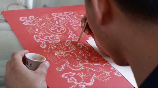 在师父的指导下,山姆学习了手绘描金粉蜡笺、流沙笺两项技艺。