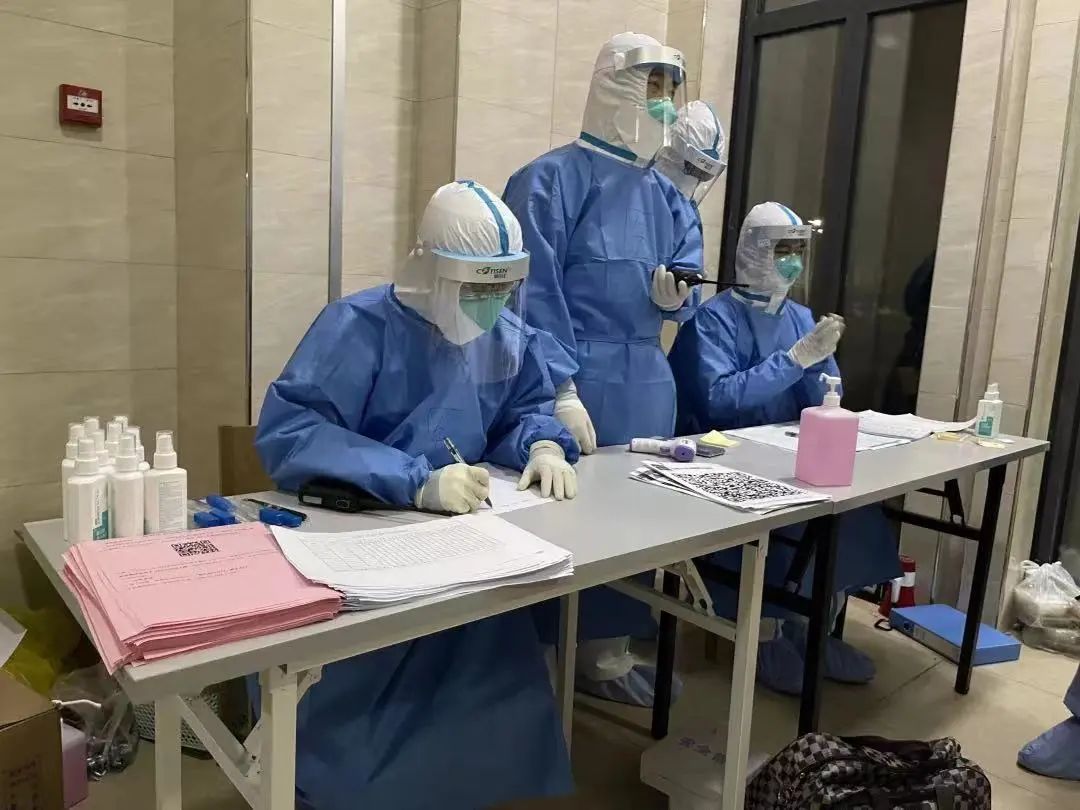 隔离点的工作时间长,内容繁杂。夜间我们要接收隔离人员,白天要制作采集试管进行上门核酸采集,每日都要对隔离人员进行健康监测、医疗保障、问诊评估、核酸试剂发放、及时转运等一系列工作。厚厚的防护服下一身身的汗水,却从未听到队员们喊累,因为我们是友谊人,是医务工作者,要时刻牢记自己的使命和医院的嘱托。
