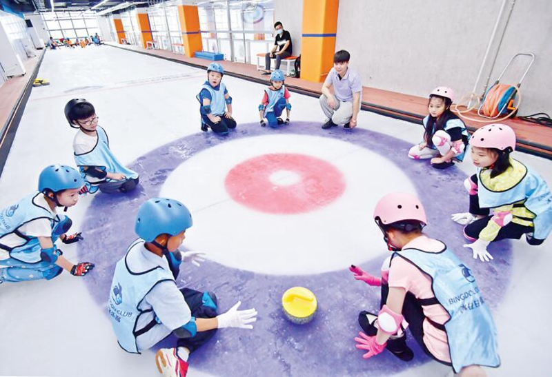 青少年在体育夏令营的冰壶场上玩“击鼓传花”游戏 图片来源:长江日报