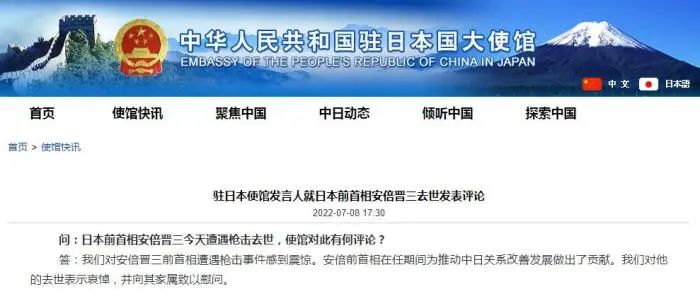 发言人指出,安倍在任期间为推动中日关系改善发展做出了贡献。我们对他的去世表示哀悼,并向其家属致以慰问。
