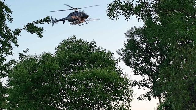 为切实加强睢县林业有害生物防治工作,有效遏制森林病虫害,保护造林绿化成果,7月8日天还未亮,睢县林业服务中心的工作人员已经开始林业有害生物飞机防治作业。贝尔407直升机喷洒出白色雾滴,飞过睢县的大片绿化林。