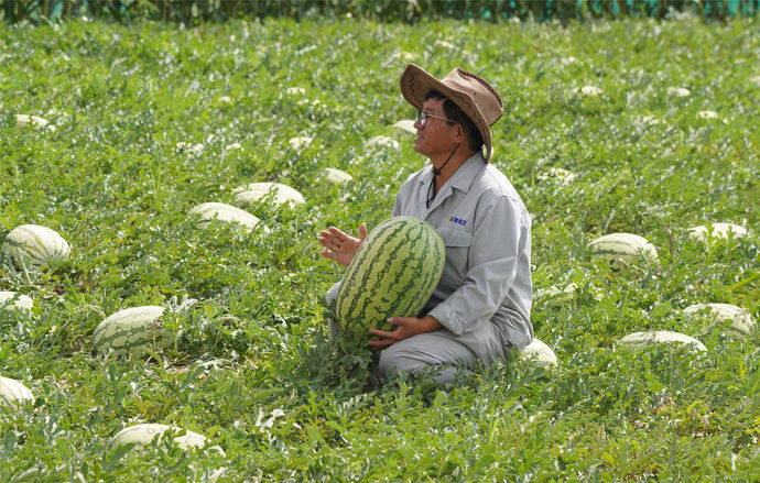 “基地应用了水土保持、土壤成岩、城市污泥无害化利用等24项技术,核心技术都是我们公司研发的,其中的土壤成岩技术达到国际先进水平,水土保持方法已经获批国际发明专利。7月25日,我们收到的当地权威检测机构出具的检验报告,显示基地种植的西瓜、西红柿等蔬菜水果相关指标完全达标,说明我们的多项综合技术在这里应用得很成功。”难掩激动之情的王福州从地里挑选了一个30多斤的大西瓜,招呼大家品尝,甜脆多汁的西瓜让大家赞不绝口。