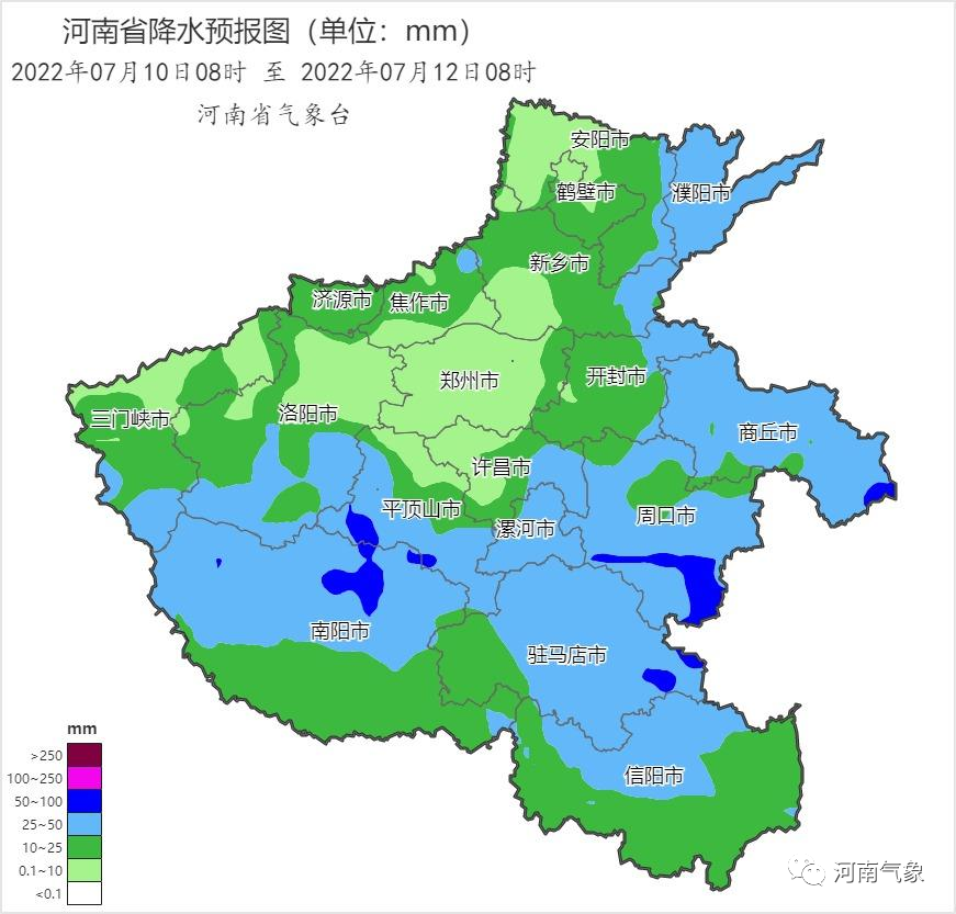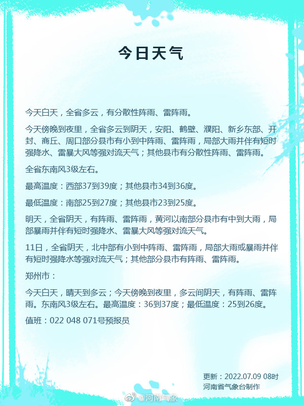 10到11日,全省大部有阵雨、雷阵雨,黄河以南部分县市有中到大雨,局部暴雨或大暴雨,并伴有短时强降水、雷暴大风等强对流天气;累计降水量全省大部20~40毫米,商丘、周口、驻马店、南阳、平顶山部分县市50~70毫米,个别站点降水可达100毫米以上;最大小时降水量60~90毫米。