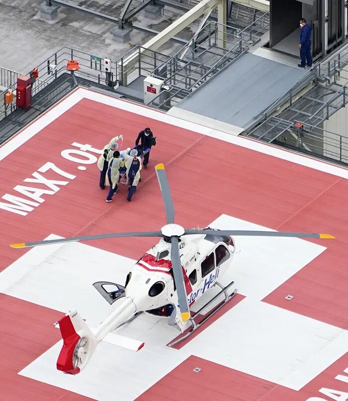 ▲7月8日,日本前首相安倍晋三由医用直升机转运至奈良县一家医院。新华社/共同社