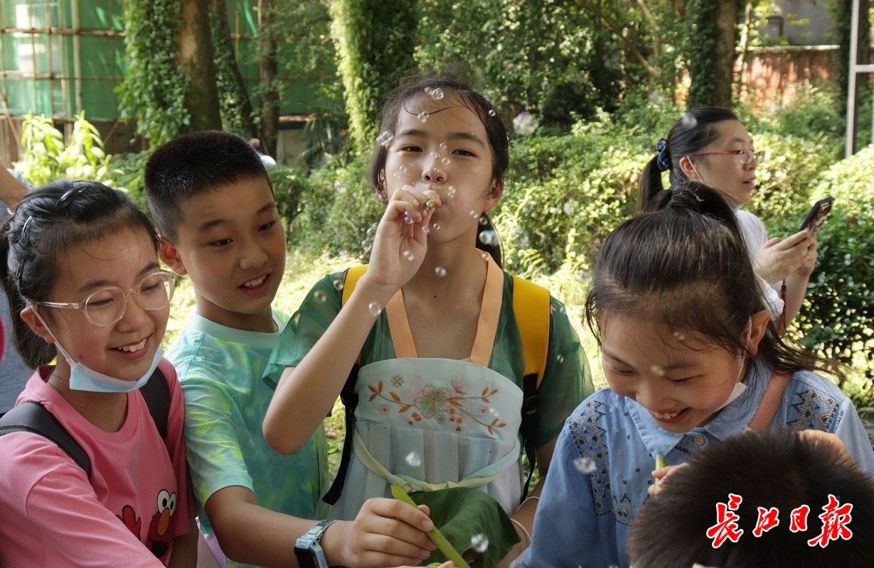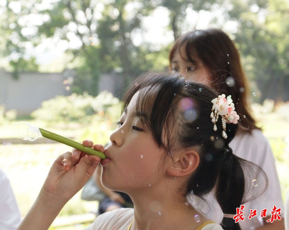 在第二个游戏“中通外直”中,孩子们用荷花的茎吹出了泡泡。曹承娥告诉大家,荷花的茎是它能在水中生活的秘密,因为茎是空心的,可以连接外面的空气。