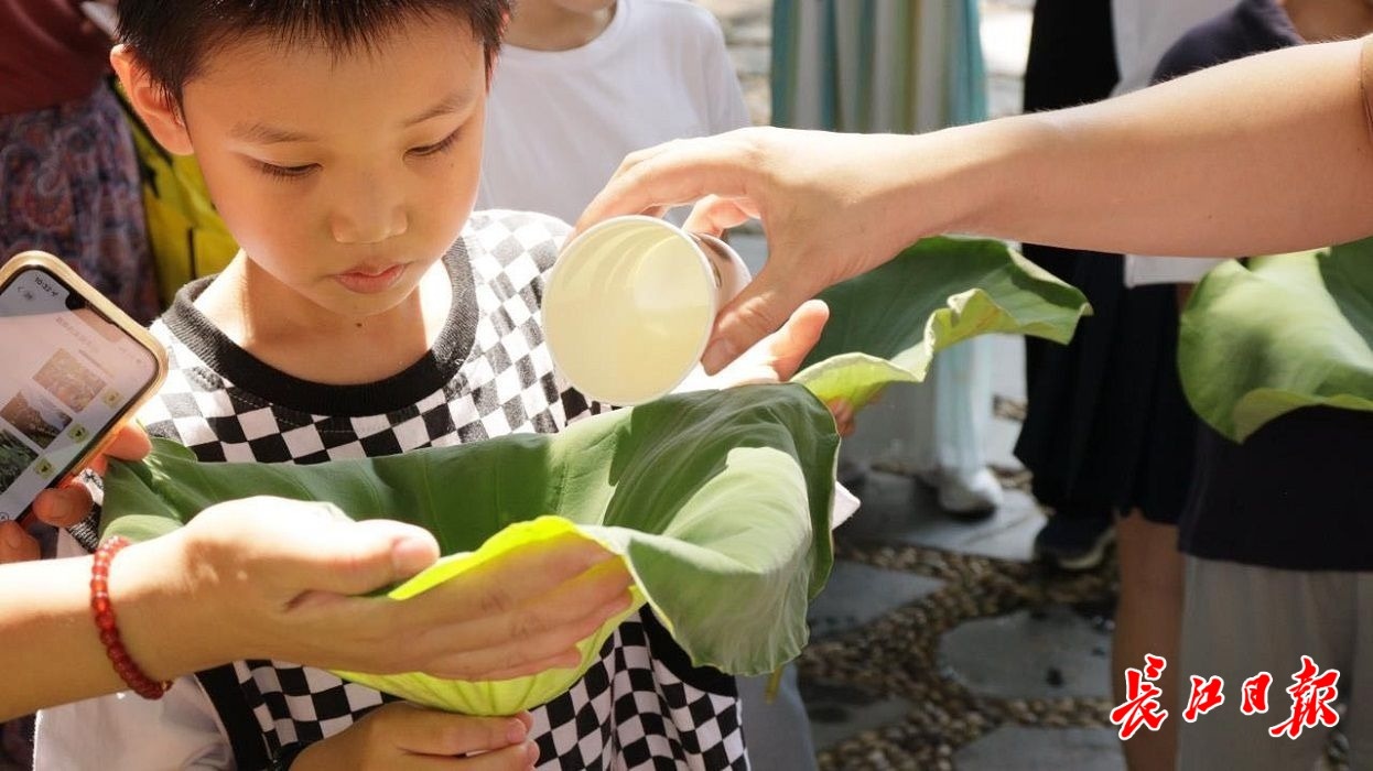 第一个谜底揭开,随后,武汉植物园工程师曹承娥又带领小朋友们玩了两个有趣的小游戏。在这之前,曹承娥问小朋友是否会背诵《爱莲说》第一段。身穿汉服的五年级王钰涵举手,并流利背诵了出来。曹承娥重点指出了其中两句话:“出淤泥而不染”和“中通外直”,这两句话分别代表了莲花的两个特点,也代表了接下来的两个小游戏。