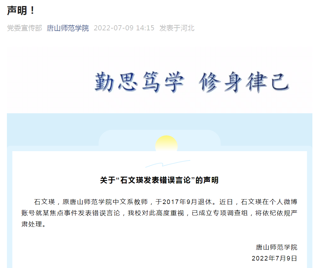 7月9日,唐山师范学院发布关于“石文瑛发表错误言论”的声明:石文瑛,原唐山师范学院中文系教师,于2017年9月退休。近日,石文瑛在个人微博账号就某焦点事件发表错误言论,我校对此高度重视,已成立专项调查组,将依纪依规严肃处理。