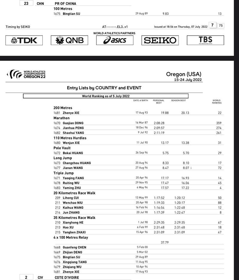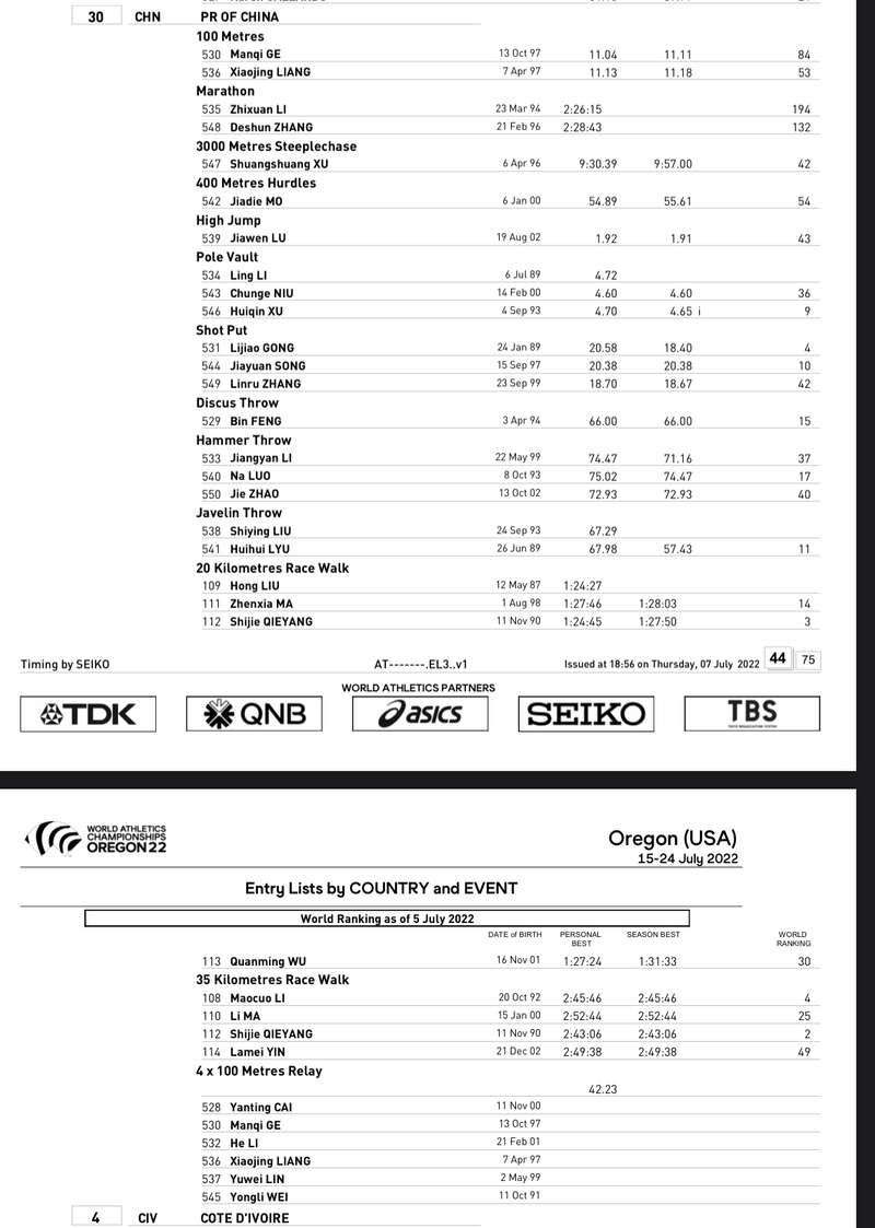 中国青年报客户端北京7月9日电(中青报·中青网记者 梁璇)2022尤金田径世锦赛将于7月15日~7月24日在美国俄勒冈州尤金市举行。根据世界田联今天在官网公布的参赛运动员名单显示,中国田径队共有53名运动员参赛,苏炳添、巩立姣、刘虹等多位名将均在列。