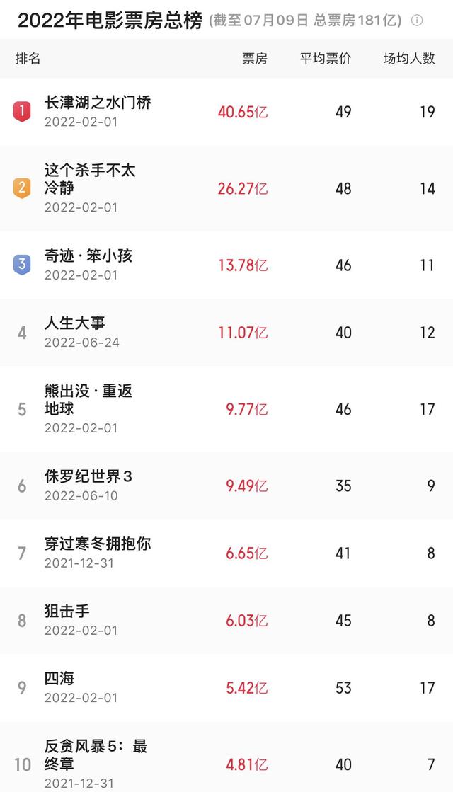 根据猫眼专业版数据,由朱一龙主演的电影《人生大事》上映16天,总票房已突破11亿元。目前,影片在2022年电影票房榜已上升至第四位。该榜单前三位均为春节档影片,由高至低分别为《长津湖之水门桥》《这个杀手不太冷静》《奇迹·笨小孩》。