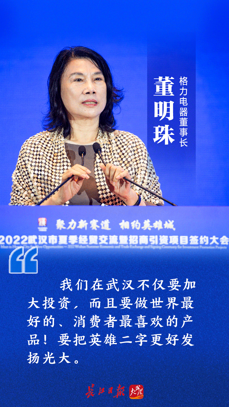 她表示,武汉是一个美丽的城市,也是个历史悠久的城市、令人向往的城市。“武汉有得天独厚的优势地理位置,更重要的是人才优势。在珠海格力电器,不少研发人员都来自在汉高校。除此,武汉的营商环境、党委政府工作作风也护航着企业的发展。”