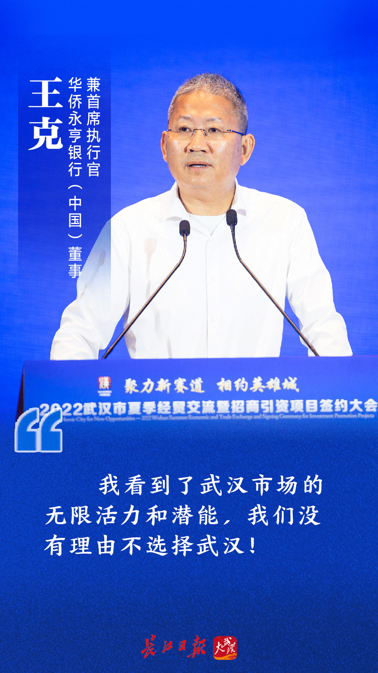 “我们没有理由不选择武汉。”本次大会上,华侨永亨银行(中国)董事兼首席执行官王克感叹,十分看好武汉,非常有信心将企业扎根在武汉。
