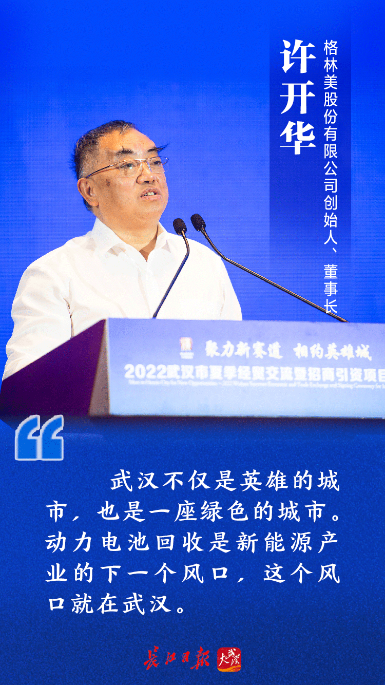 他透露,最初,企业在武汉的工厂很小,就一小栋厂房,产值也少,税收几乎可以忽略不计,“但武汉却十分重视我们。这说明武汉对民营企业的重视,对绿色发展的重视,对外来投资者的重视。”许开华说,武汉海纳百川,不仅是英雄的城市,也是一座绿色的城市。他相信,动力电池回收是新能源产业的下一个风口,这个风口就在武汉。