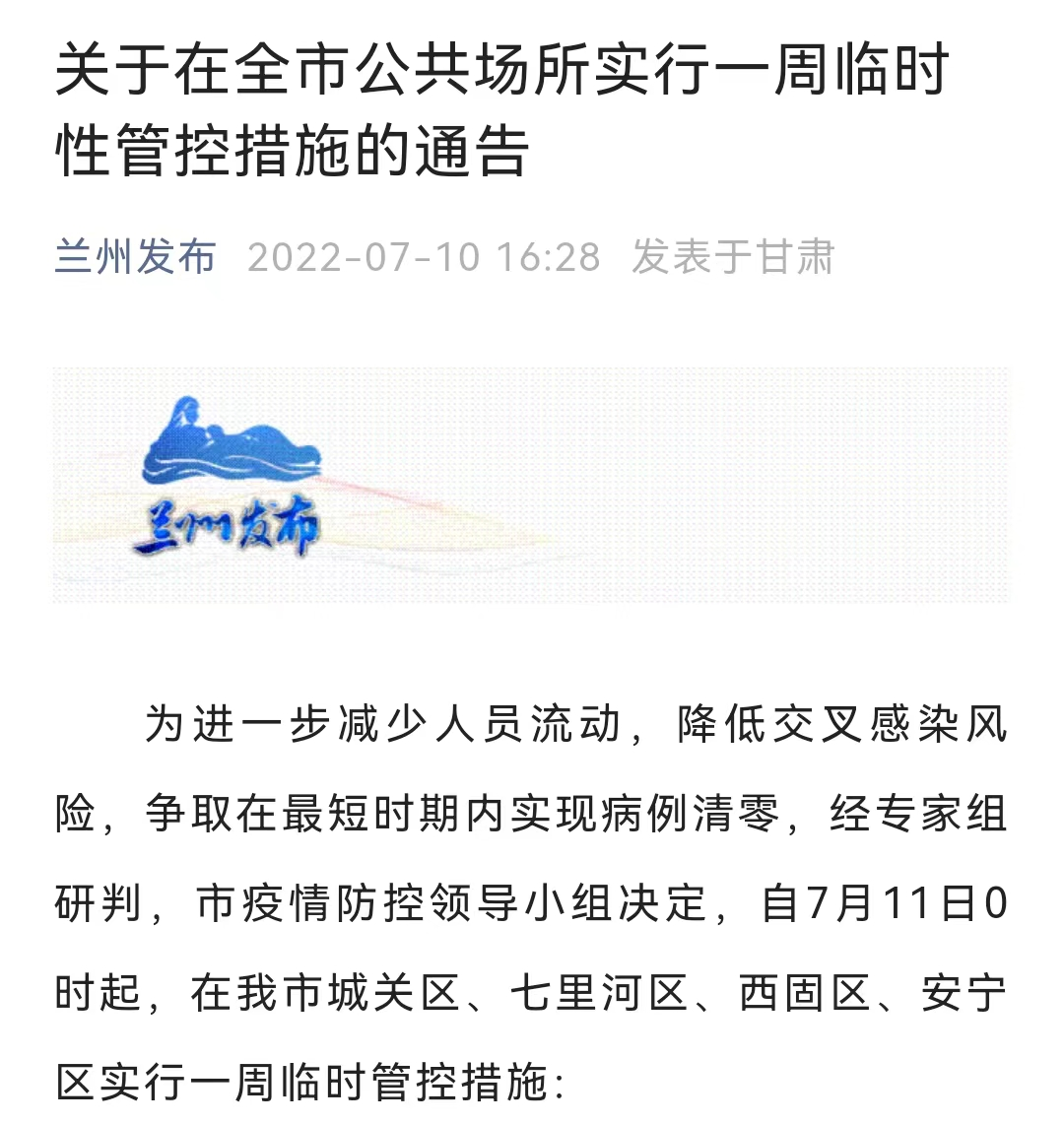 为进一步减少人员流动,降低交叉感染风险,争取在最短时期内实现病例清零,经专家组研判,兰州市疫情防控领导小组决定,自7月11日0时起,在我市城关区、七里河区、西固区、安宁区实行一周临时管控措施:
