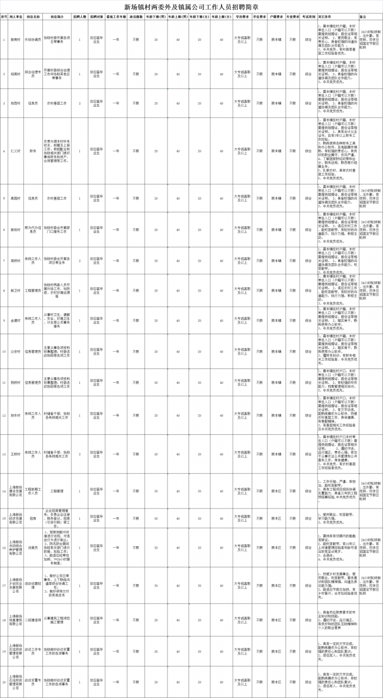 3.村两委外应聘人员需具有新场镇在村户籍,最低工作年限一年(工作年限计算截止到2022年6月30日,以缴纳本市职工社会保险费或个人所得税为准),年龄在20周岁-40周岁(即1982年1月1日-2001年12月31日出生),大专及以上学历