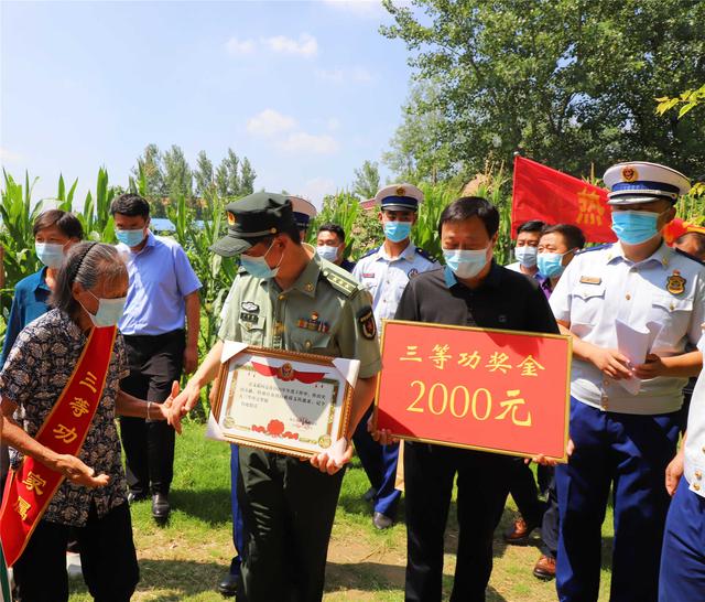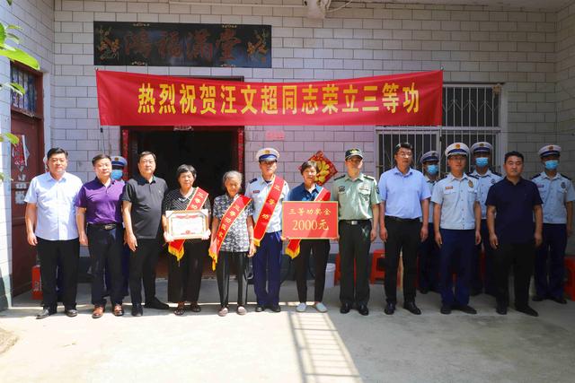 立功受奖送喜报,十里八乡成美谈。7月8日,柘城县人武部、县退役军人事务局,县消防救援大队、李原乡党委政府等单位共同为荣立三等功的汪文超及其家属送喜报、送光荣。