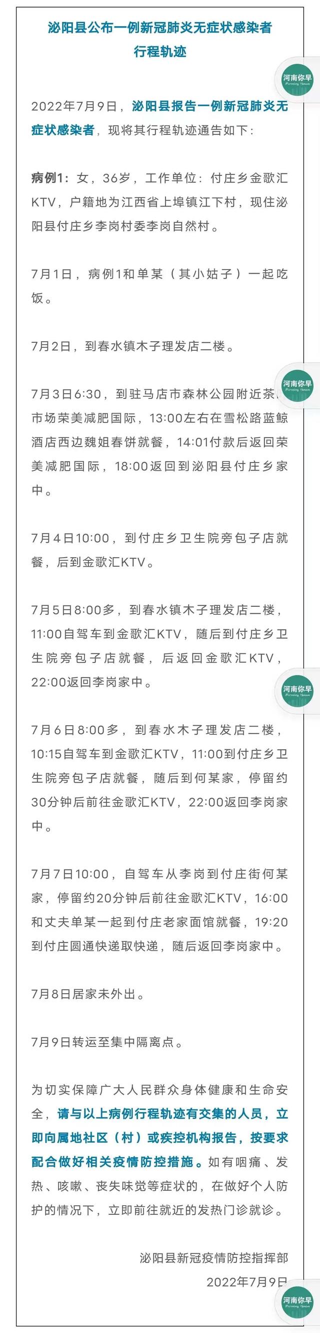 ⭐7月9日,驻马店泌阳县公布1例无症状感染者行程轨迹。