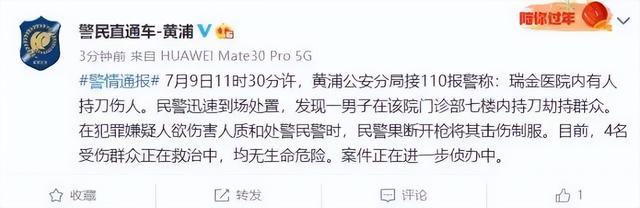 ⭐上海警方通报:9日,上海交通大学医学院附属瑞金医院发生持刀劫持人质事件,造成4人受伤。民警开枪将犯罪嫌疑人击伤制服,4名受伤群众正在救治中,均无生命危险,案件正在进一步侦办中。