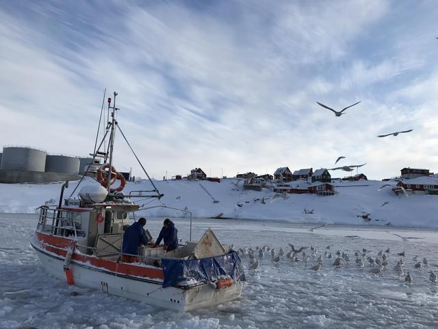 在格陵兰岛这个全年平均气温在0℃以下、绝对最低气温可达零下70℃的冰雪王国,抬眼所见无不是冰,人与动物的生存必然都是艰难的,所以每有渔船返回港湾,大群的鸟儿便会盘旋在船的周围,大概是闻到船上的渔获,又或者是期待善心的人类能赐予一点食物。看到它们在冰面上四处奔波觅食,心有不忍,我想这冰要是天暖了化开多些就好了,可是却忘了另一头,天暖了,冰化了,北极熊们的日子可就苦了。